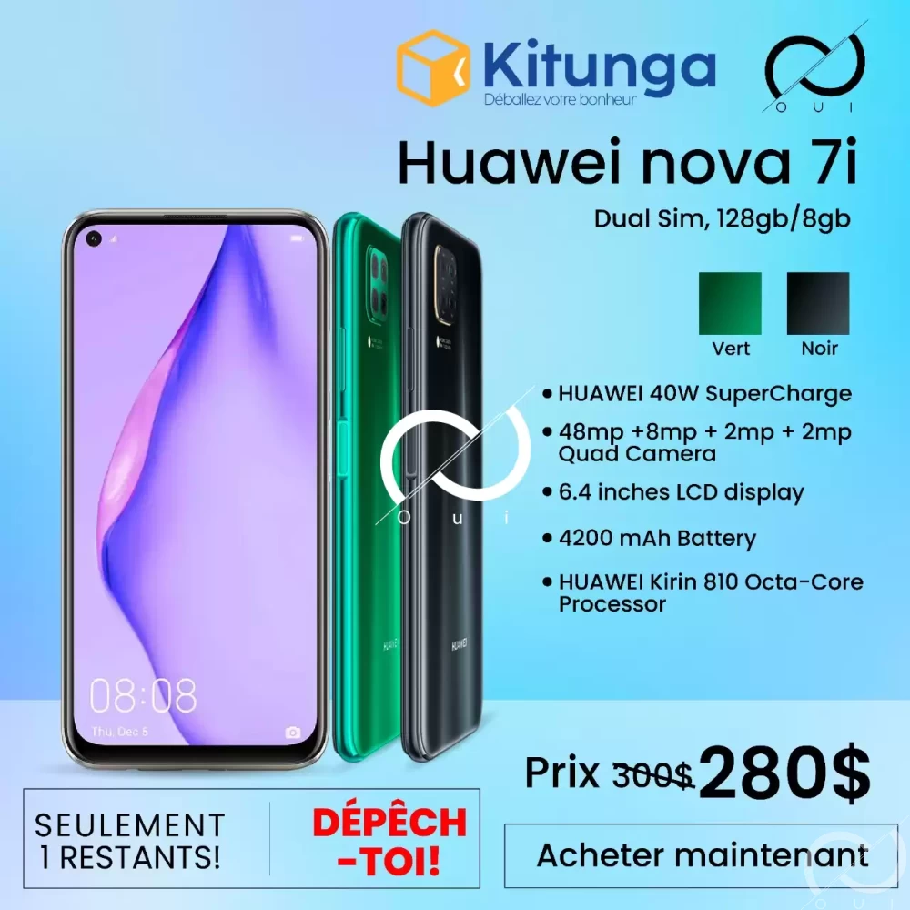 *Huawei Nova 7i *Dual SIM *128GB/8GB *Dimensions: 159.2 mm x 76.3 mm x 8.7 mm *Weight: 183 grams *SoC: Hisilicone Kirin 810 *CPU: Octa-Core *GPU: Mali-G52 MP6 *RAM: 8 GB *Storage: 128 GB *Memory card: Yes *Display: 6.4 inches, IPS LTPS capacitive touchscreen, 2310 x 1080 pixels *Battery: 4200 mAh, Li-Polymer *OS: Android 10.0 (Q) Nubia Red Magic UI *Camera: Main – 48 MP + 8 MP, 2 MP, 2 MP; Front camera 16 MP *SIM card: Nano-SIM *Wifi: 802.11 a/b/n/n, Dual-Band, Wifi Hotspot, Wifi Direct *USB: USB Type-C *Bluetooth: v5.0 *Positioning: GPS, A-GPS, GLONASS, BDS