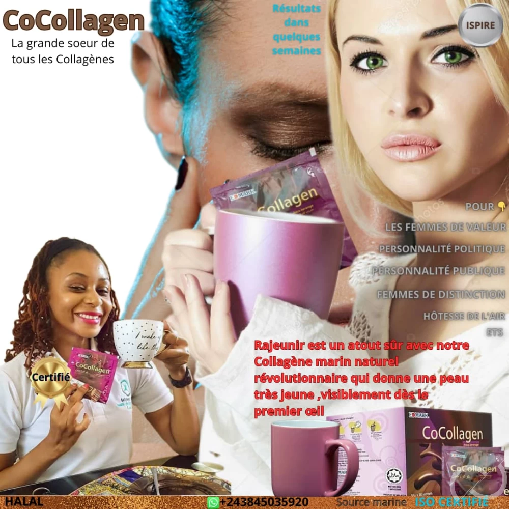 Le Co'collagen raffermi la peau, rajeunit la peau, vous rend très belle, donne un teint très frais visiblement, élimine les rides, les cernes autour des yeux et de la bouche, réduit les vergetures, enlève les sillons et les cicatrices, vous débarrasse de l'hyperdépigmentation (peau brûlée par le soleil soit les mauvais produits de beauté ) , enleve les signes de vieillissement, rajeunit les peaux sèches et matures, ramolli les pattes d'oie, vous donne un teint radieux,repulpe les lèvres, remonte, revive , raffermi le corps de la femme tout entière en lui rendant jeune devant son mari ( soulage des problèmes intimes de la femme) , améliore votre apparence en vous rajoutant une beauté dès le premier oeil, réduit aussi l'infidélité dans le couple car le mari n'auras plus à convoiter dehors, car la femme qui a consommé notre Co'collagen reste ferme comme un enfant de 18 ans ce Co'collagen est aussi recommandé aux filles qui préparent leur mariage dans 1 mois pour leur permettre d'apparaître très belle, ferme, propre, fraiche et élantante le jour leur mariage et pendant le mariage. Ce Co'collagen vous permet de rajeunir quelques soit vôtre âges, pour un corps parfait et ferme en tout temps. N'oubliez pas que les enfants aiment voir leurs mères très belle et jeune ce Co'collagen est notre produit favoris et nous le commercialisons avec beaucoup d'amour car c'est une mission noble, retenez que ce Co'collagen est naturel et ISO certifié, vendu dans des grands pays tel que le Canada, les États-Unis, les Emirats etc. disponible au Congo Kinshasa car notre soucis est d'apporter la meilleure qualité et le meilleur choix car les satisfactions successives sont notre priorité. Les bienfaits de notre produit favoris Co'collagen sont énormes. Co'collagen est riche en haut teneur de collagène marin de très haute qualité. Pendant votre cure de Co'collagen La première personne à remercier sera vous même car vous êtes la personne la plus chanceuse à découvrir les secrets des femmes qui est notre Co'collagen. +243 845035920.